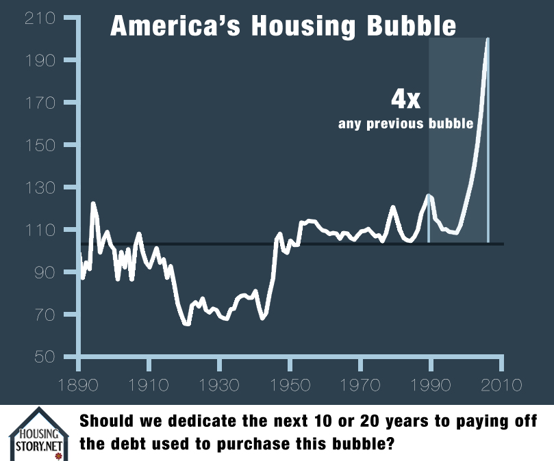 Property values blew up in the bubble four times higher above trend when compared to any previous bubble. Should our policy pretend this debt is valid and normal? Or we should we call this debt the product of irrational mania? Should we dedicate the next 10 or 20 years to paying off the debt used to purchase this bubble (Please see the chart above showing the wild move up in housing prices.)? Or should we take a dagger to its heart and liquidate it now?
