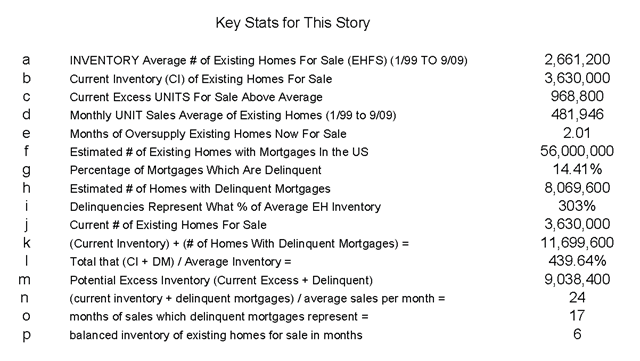 Given the cure rate for past-due mortgages has decreased to near zero in the land of milk and negative equity, if you add in the 8 million delinquent accounts to the current existing-homes-for-sale pool of 3.6 million units, you now have a total supply for sale of almost 12 million. The long-run average inventory of “for sale” existing units is 2.6 million.