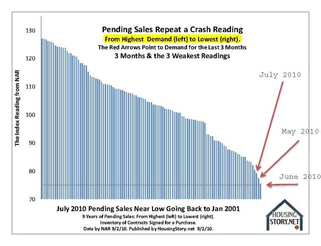 Reuters, anonymous: “Pending sales of previously owned U.S. homes rose unexpectedly in July …. Suggesting a tax credit-related housing market decline was close to bottoming.” MDW: In truth, dear anonymous Reuters contributor, the data suggests that the market is stuck in the bottom. That’s different. That’s bad.