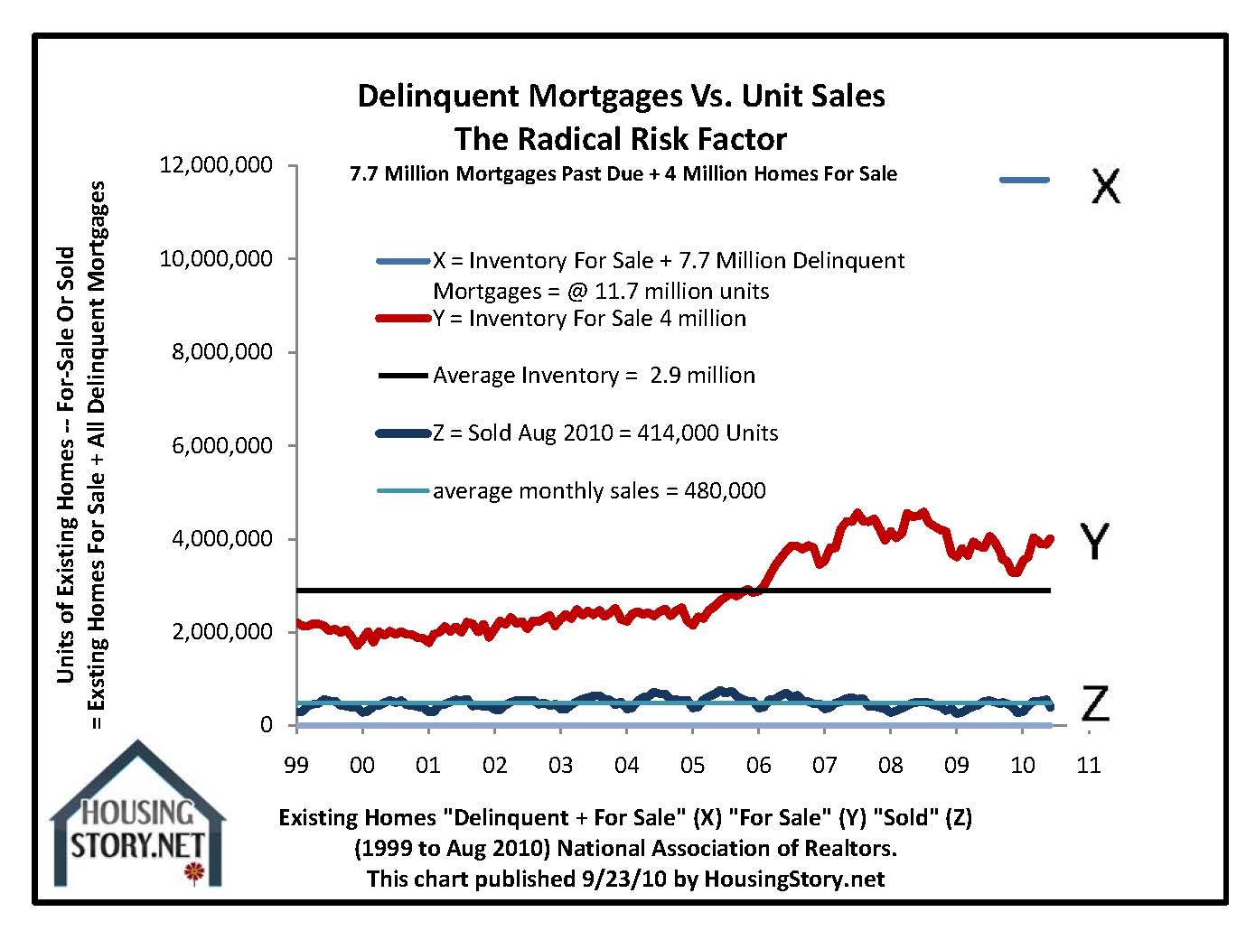 Buyers of residential real estate act inside of the context of a deluge of negative risk factors. One in seven borrowers is delinquent. Nearly five percent are in foreclosure. The cure rate on delinquent mortgages is effectively zero once the loan goes to 60-days late. Approximately 13 million homeowners have no equity or negative equity. Almost five million homeowners have negative equity greater than 125% loan-to-value (Please see the chart above comparing monthly unit sales, total inventory, and the number of delinquent mortgages.). Strategic default is a viable option in the mix coming out of the worst recession since the Great Depression.