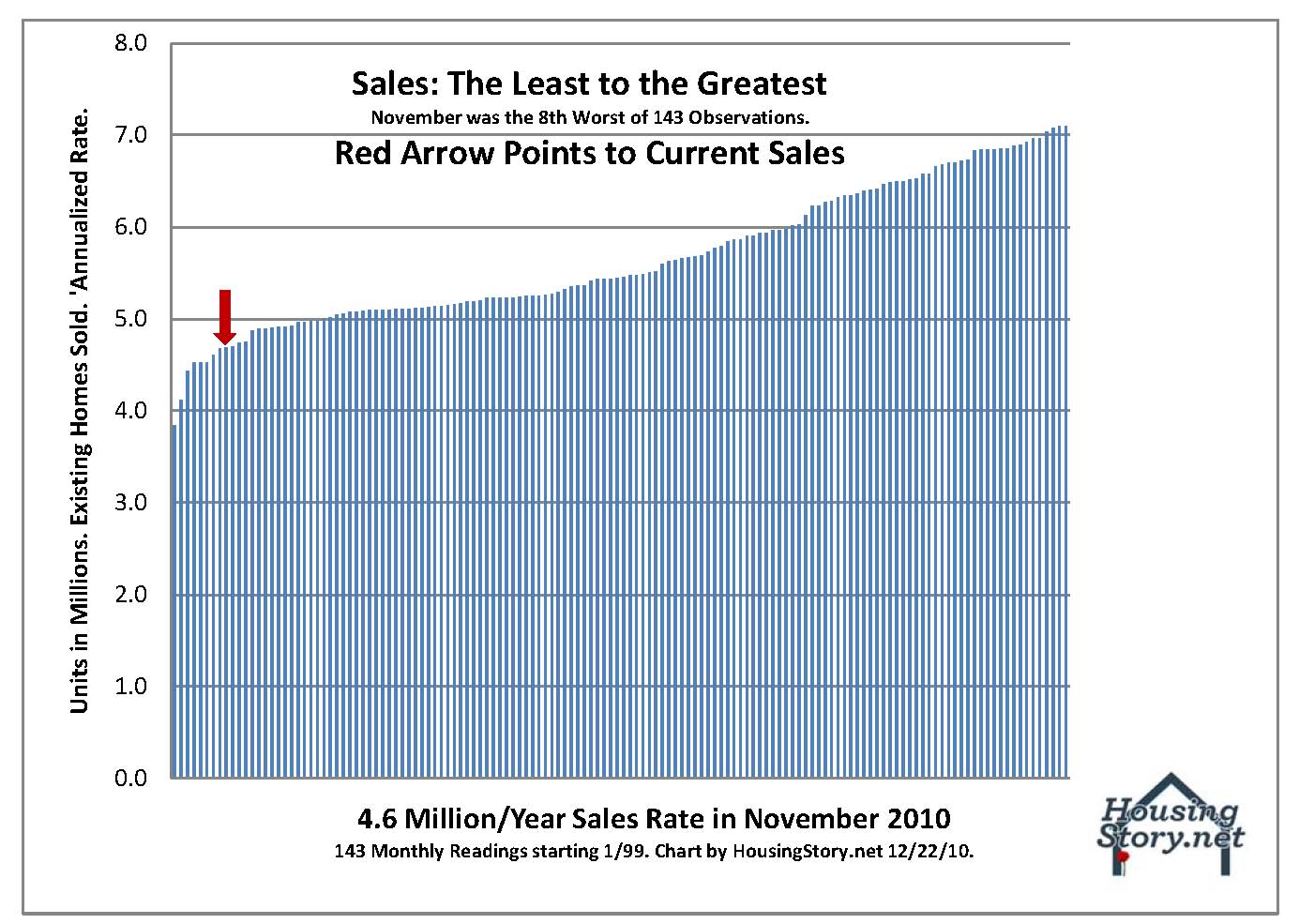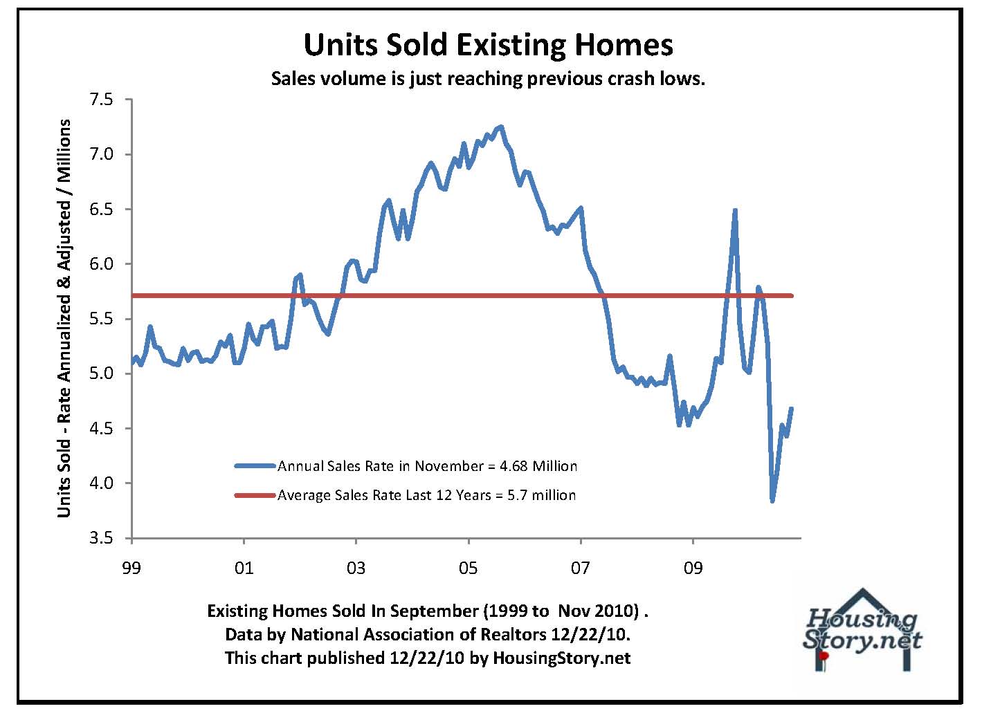 The acid test of price, closed sales in units, here measured at an annualized-and-adjusted rate, clocked in at 4.68 million units/year in November according to the National Association of Realtors. This sales pace is just 150,000 units/year above the worst crash reading for all of 12 years of data — prior to July 2010 when demand died and went away for the winter (Please see chart below of unit sales and note we are worse off than the 2008 crash.).