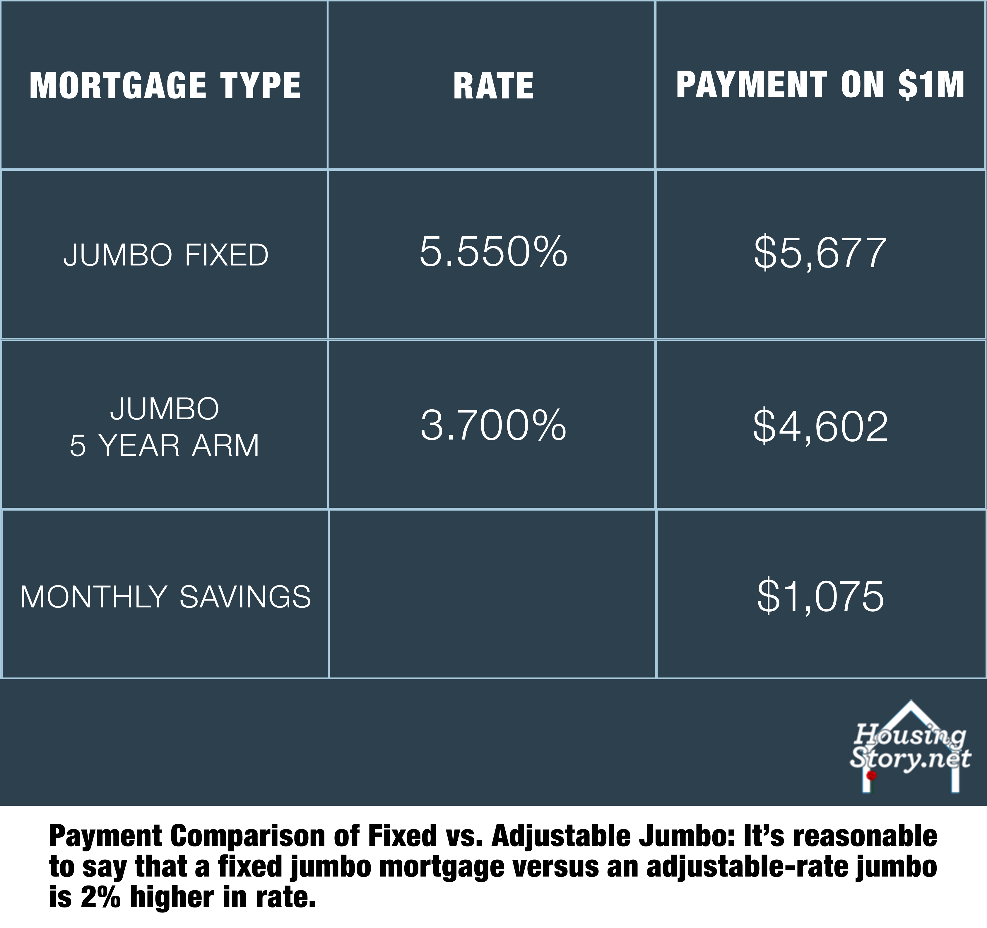The bottom line is that fixed-rate jumbo mortgages are very expensive when compared to rates on jumbo adjustable rates and conforming rates. The more important point is that jumbo mortgages are available with outstanding rates, but you have to accept an adjustable rate to get an outstanding rate.