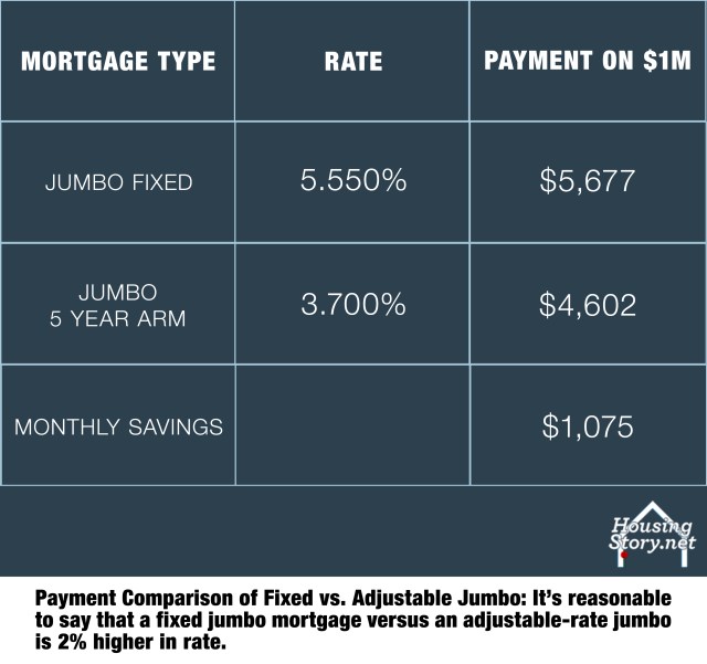 There are two good ways to show the higher cost of jumbo mortgages. Check out the spread between a 30-year fixed-rate jumbo mortgage and a adjustable-rate jumbo mortgage. And check out an adjustable jumbo versus an adjustable conforming mortgage.