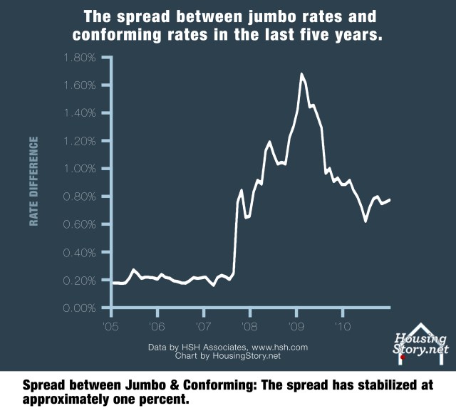 A rule of thumb for jumbo loans says their interest rates are 1% higher than conventional loans, but this spread changes constantly (Please see the chart above showing the spread between jumbo and conforming rates from 2005 to today.).