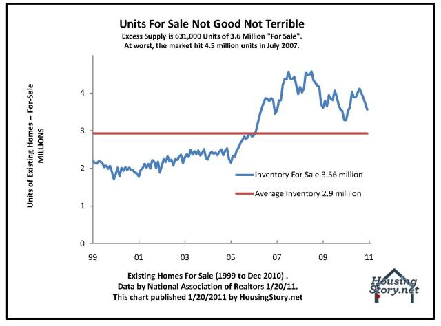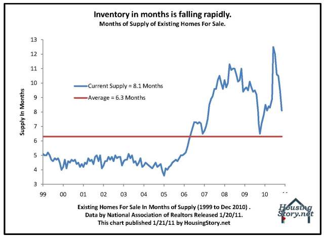 If the current supply of homes for sale is approximately 8 months, as the first graph indicates but the actual supply of homes including shadow inventory is approximately three times greater than the number of those officially for sale, as the third graph indicates, then the current supply of homes is actually around 24 months.