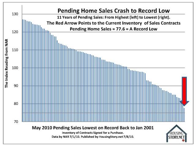 The Index of pending home sales fell a record 30% in May to a record-low reading of 77.6 — two hugely pessimistic predictors of future prices nationwide. Yet the combination of two record negatives went barely reported when the stats were announced last week.