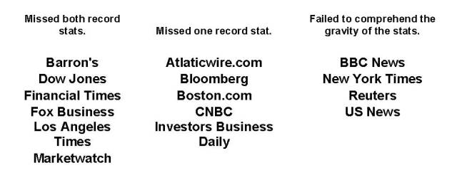 Among the outlets who failed to uncover either of the two record negative stats are Barrons, Dow Jones, The Financial Times, Fox Business, The Los Angeles Times, and Marketwatch.
