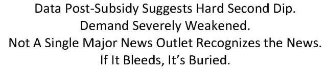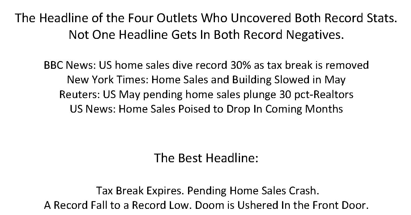 The oversight by major news outlets — snubbing record negatives — is egregious by virtue of its ignorance of the expiration of the free-down-payment program. The pending-home-sales stat gave us our first view of buyer demand for housing without the hugely popular prop from the federal government.