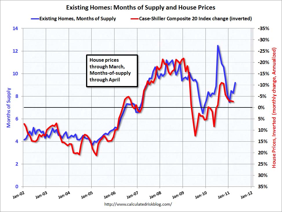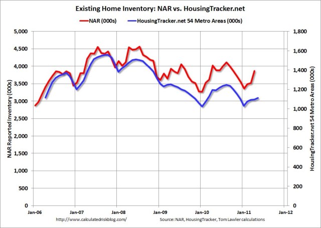 The journal reporters suggest an “ultraconservative” approach. Only purchase when the cost to own is cheaper than the cost to rent. That means you should wait for the monthly cost of ownership including principal, interest, property taxes, fire insurance and upkeep to equal the rent bill you would pay for a similar home. (Please see the chart below showing price and inventory trends. Click chart for large image.)