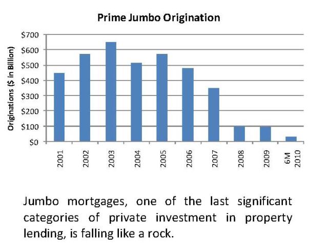 Risk is so high in today’s real estate market that private money has largely left the mortgage category. The retreat is most easily seen in the jumbo mortgage market. Total jumbo mortgage origination has fallen from a high of $650 billion in 2003 to $92 billion in 2009 (see the chart above). Government loans account for 90% of current originations.