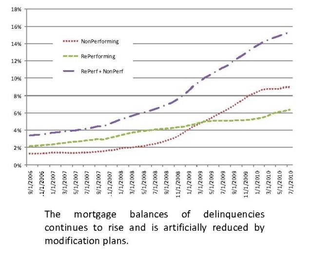 “This ‘improvement’ (in mortgage performance) simply reflects large scale modification activity having served to artificially lower the delinquency rate” (Please see the chart above of mortgage balances delinquent and re-performing. All charts in this post are from “Amherst Mortgage Insight” dated October 1, 2010.).