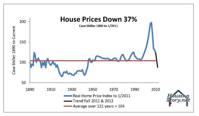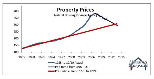 The HousingStory.net average of indexes predicts a total fall from peak-to-trend of 33%. By that measure current vales have fallen 24% from the top.