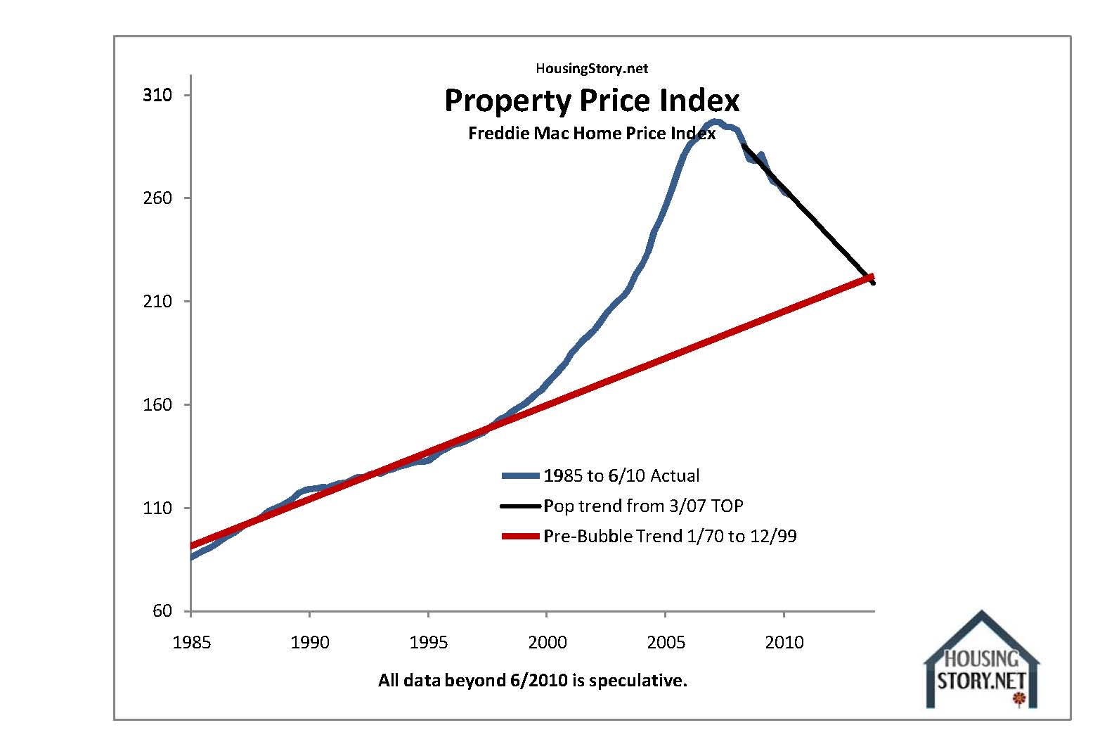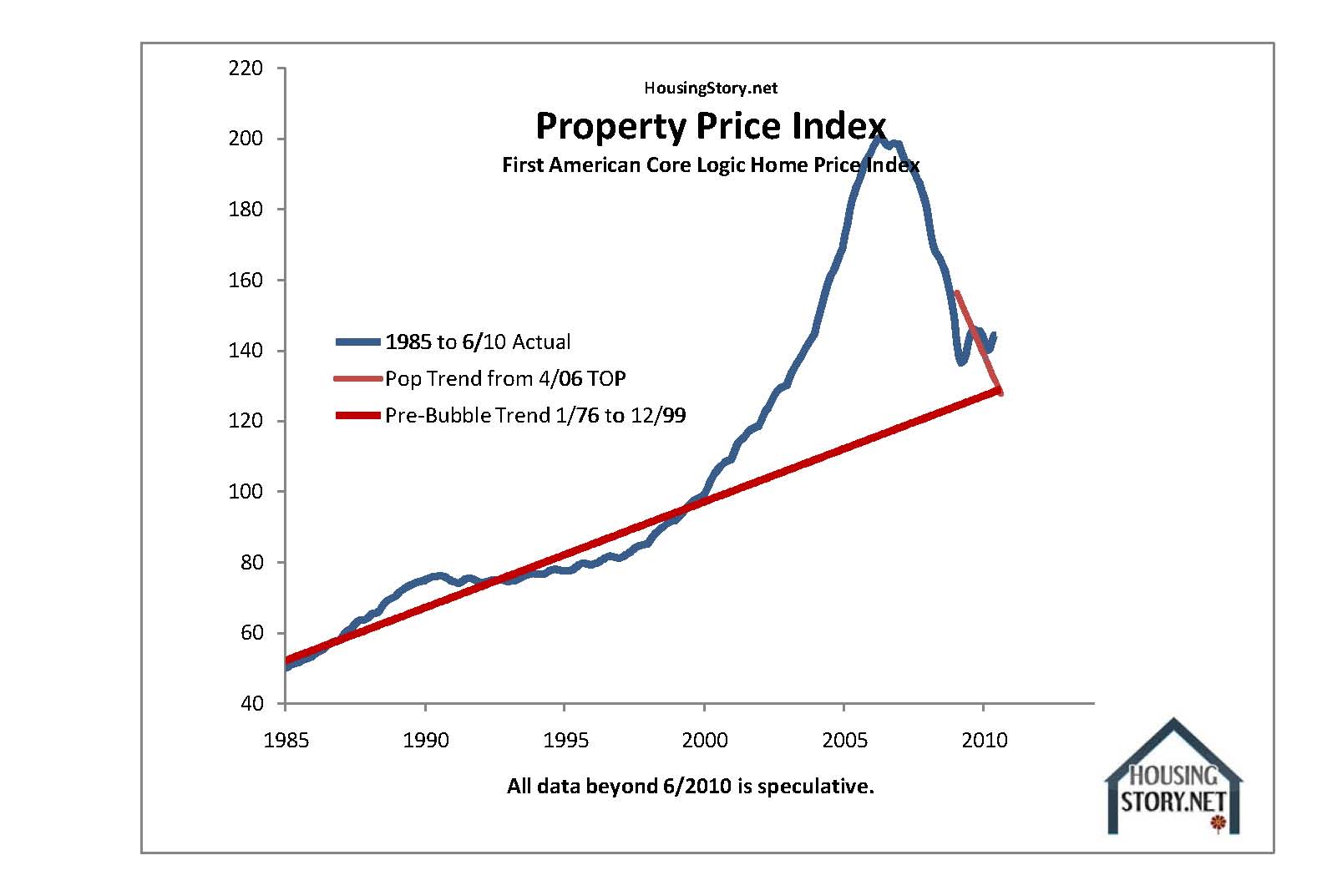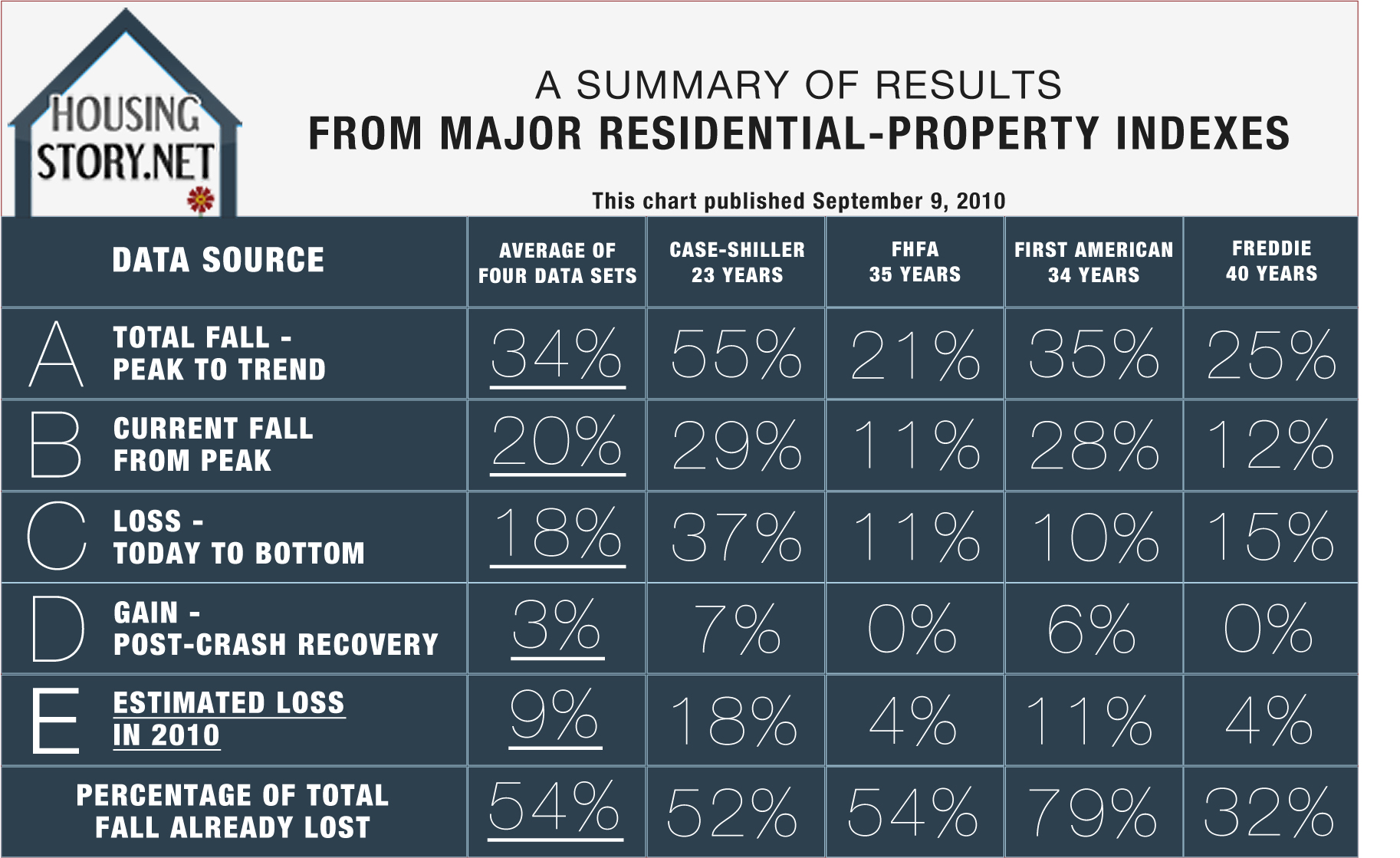 HousingStory.net surveys and averages the data of four major property price indexes including Case-Shiller, the Federal Housing Finance Agency (FHFA), First American, and Freddie Mac (Please see the results immediately below.). All charts are based upon actual data through June 2010.