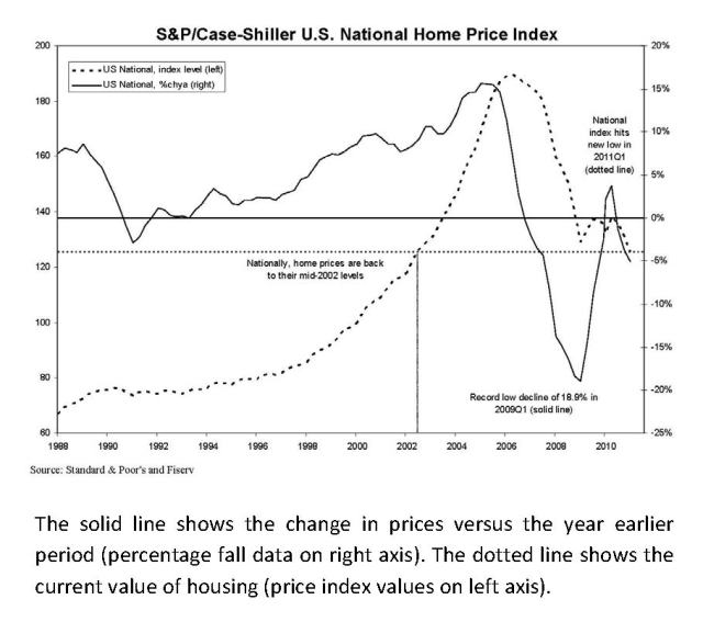The Case-Shiller 20-city index released today has fallen under the bubble-crash low of April 2009 and confirms a double-dip in home prices. S&P reports a 4.2% national fall in values just in the first quarter of this year.
