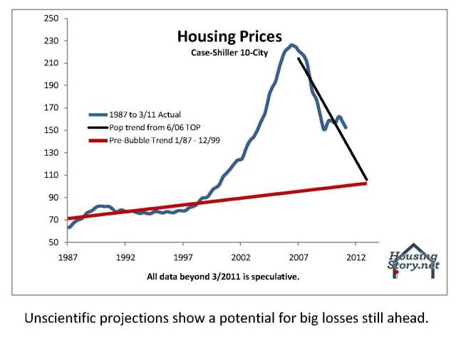 “In real terms, all appreciation in the last decade is gone,” said Bill McBride, author at Calculated Risk, a leading source of breaking news in charted format (see Case Shiller data above).
