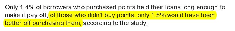 A press report on this paper says that 1.5 percent of borrowers who used yield spread to pay for their loan would have been better off using points. If you told the New York Times editorial writer that his ban on yield spread would force 98.5% of borrowers to choose a more expensive and less affordable loan paid for with points, he would have looked at you as if you had said a unicorn is green with a white horn. Why?