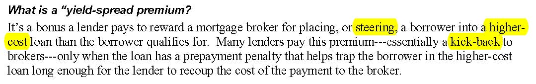 It’s simple. He copied somebody else’s work. Yield spread, according to the Center for Responsible Lending, is “a bonus a lender pays to reward a mortgage broker for placing, or steering, a borrower into a higher cost loan than the borrower qualifies for” and “Many lenders pay this premium—essentially a kick-back to brokers“ (“Bans on Yield-Spread Premiums & Steering: Protecting Homeowners and Strengthening the Mortgage Market” Nov. 5, 2007, Center for Responsible Lending).