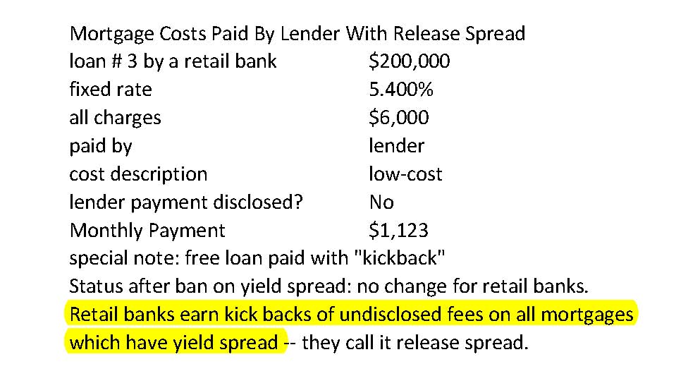 If we define a kickback as an undisclosed payment, then retail banks are earning “unethical” kickbacks because they do not disclose their release spread premium. Yet the Times policy would shift all mortgage business to the “unethical” retail banks who hide their “kickbacks” legally (Please see the example below.).
