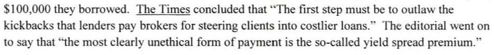 What makes the statement embarrassing for the editorial writer and for the New York Times is that the fees the writer is referring to in sentence 10 are yield spread premium fees. The primary argument of the editorial is that “the most clearly unethical form of payment (to mortgage brokers) is the so-called yield-spread premium” (sentence 17) and they should be outlawed.