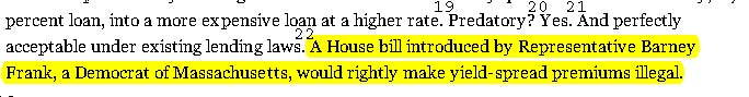 “A House bill introduced by Representative Barney Frank, a Democrat of Massachusetts, would rightly make yield-spread premiums illegal.” (Sentence 22 of the editorial).